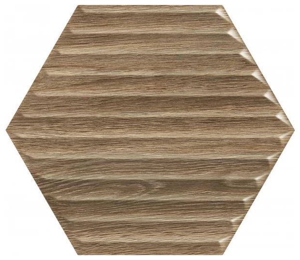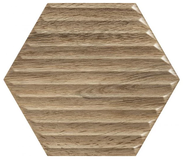 Woodskin Wood Heksagon B STR to glazura ścienna, która zwraca uwagę swoim kształtem oraz powierzchnią. Płytka ma typowy heksagonalny kształt, który nadaje wnętrzu geometrycznego porządku, ale nie narzuca monotonii. Dzięki matowej, strukturalnej powierzchni uzyskano efekt drewna, który wygląda naturalnie i pozbawiony jest sztucznego połysku. Odcienie brązu i beżu na płytce uspokajają wizualnie i łatwo komponują się z różnorodnym wystrojem.