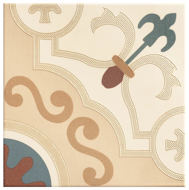 Romulo dekor 20x20 to niewielka terakota podłogowa o jasnej, stonowanej kolorystyce, w której dominują beże, brązy oraz akcenty niebieskiego. Na pierwszy plan wysuwa się geometryczny wzór, składający się z giętych linii i klasycznych, ozdobnych motywów, które przypominają elementy architektoniczne średniowiecza. Wzór nie jest przesadnie skomplikowany, ale jednocześnie dodaje charakteru, nie pozwalając, by przestrzeń wydawała się monotonna.