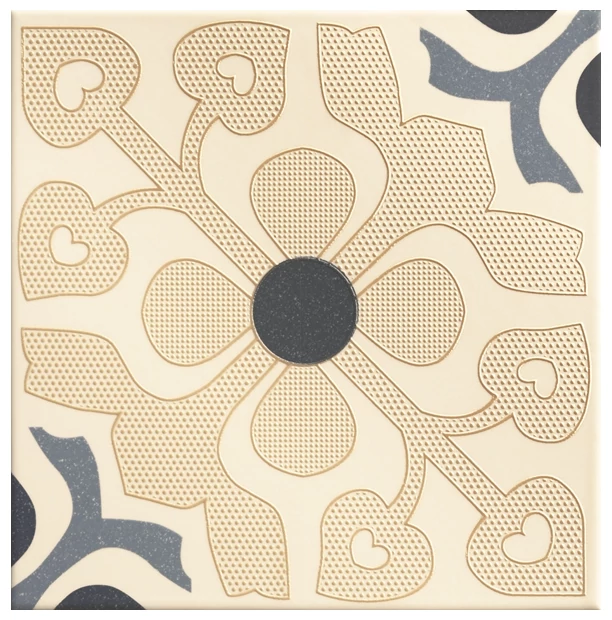 Ta mała płytka podłogowa o wymiarach 20x20 cm zwraca uwagę oryginalnym, geometrycznym wzorem. Jego forma pozostaje wyrazista, choć nie aż nazbyt skomplikowana. Wzór łączy eleganckie kształty liści z rytmicznym, symetrycznym układem - całość sprawia wrażenie uporządkowanej geometrii, co pasuje do klasycznych i nowoczesnych wnętrz.
