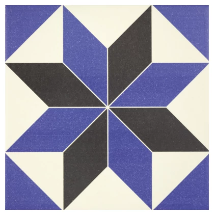Victorian GEO Centro 20x20 to mała terakota podłogowa o wyraźnym, geometrycznym wzorze. Projekt łączy prostotę z kontrastem - niebieskie i czarne elementy pokrywają powierzchnię płytki, układając się w wyraźny, ostry wzór. Powierzchnia satynowa nadaje subtelny połysk, który pozwala zachować równowagę między matowym wykończeniem a lekkim blaskiem. To nie jest gładka monotonia, ale także nie przesadna ostrość - płytka prezentuje się bardzo przejrzyście.