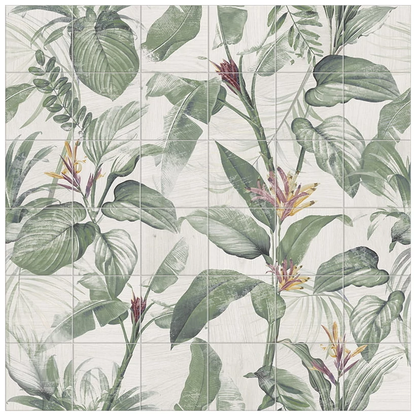 Produkt Mural Spring Leaves 36-Elem. dekor 20x20 to zestaw małych, matowych płytek, które tworzą efekt dużego muralu z motywem roślinnym. Dominująca kolorystyka opiera się na różnych odcieniach zieleni oraz delikatnych beżach i kremach. Dzięki temu kompozycja zyskuje świeży i nieprzesadzony charakter. Roślinne wzory są szczegółowe, ale nie krzykliwe, co zwraca uwagę bez nadmiernego dominowania przestrzeni.