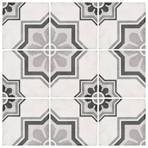 Ten gres dekoracyjny z kolekcji Art Nouveau od producenta Equipe to przykład małego formatu 20x20 cm. Jego matowa powierzchnia eliminuje niechciane odblaski, dzięki czemu wzór z ornamentem prezentuje się wyraźnie i spokojnie, bez efektu przesadnego połysku. Paleta z wykorzystaniem szarości i czerni na białym tle tworzy dosyć stonowany, ale jednocześnie wyrazisty wzór. Ornamenty zostały zaaranżowane tak, by po ułożeniu płytek tworzyć powtarzalny motyw z geometrią i lekkim detalem floralnym.