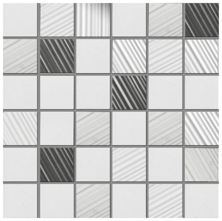Noise Blanco 5x5 to mozaika o wymiarze 29,75x29,75 cm, która łączy w sobie różne faktury oraz odcienie bieli, szarości i grafitu. Ułożenie kwadratów z delikatnym, liniowym wzorem zestawione z gładkimi kafelkami tworzy interesujący wizualnie efekt, nieprzesadzony, a jednocześnie wyrazisty. Za połysk odpowiada powierzchnia lakierowana na wysoki połysk, co dodaje lekkości i podkreśla nowoczesny charakter całej kolekcji Neutral od producenta Aparici.