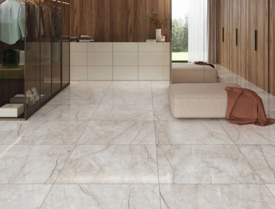P.E. Balos White SAT pokazuje chłodny, kamienny charakter powierzchni. Jasna, kremowo-szara tonacja z subtelnymi żyłkami tworzy neutralne tło, które nie narzuca się aranżacji. Powierzchnia ma satynowe wykończenie - widoczne odbicia nie są agresywne, raczej stonowane i eleganckie.