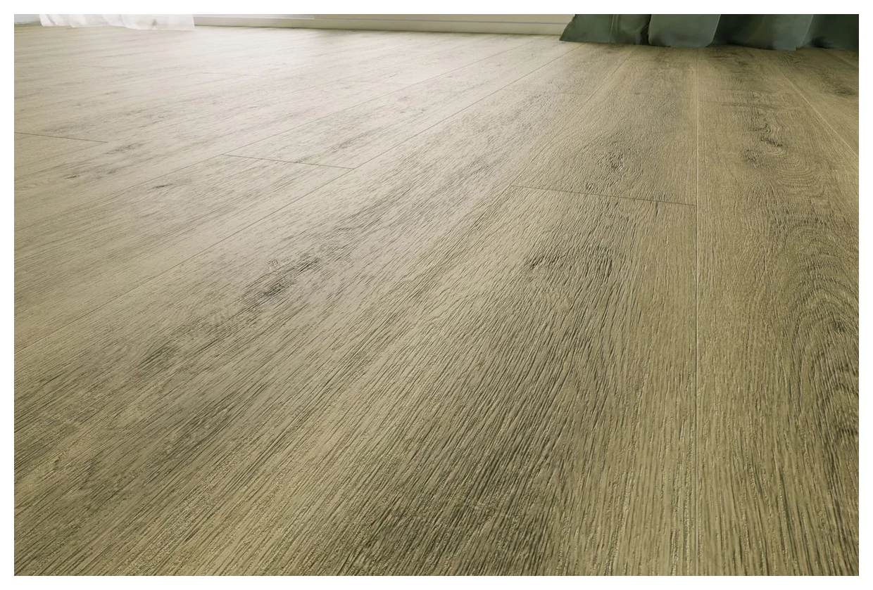 Naturalny, jasny dekor dębu o wyraźnej strukturze słoi i lekko zmatowionym wykończeniu. Panele układają się w długie pasy, co optycznie wydłuża przestrzeń i podkreśla kierunek ułożenia. Widoczne sęki i nieregularności rysunku dodają podłodze surowości bez przesadnej ornamentyki.
