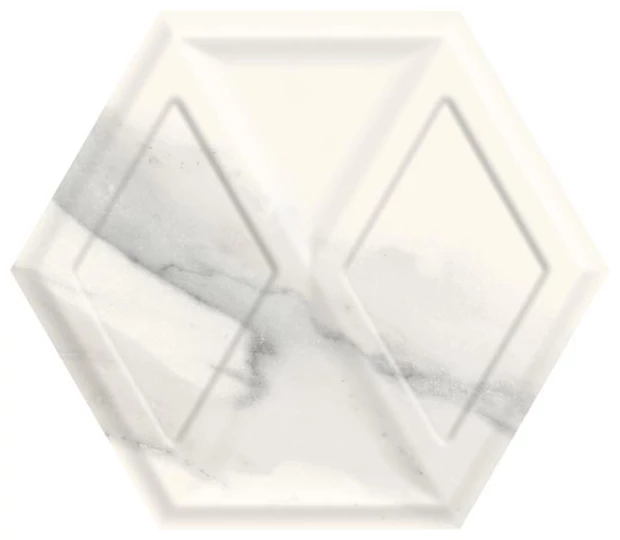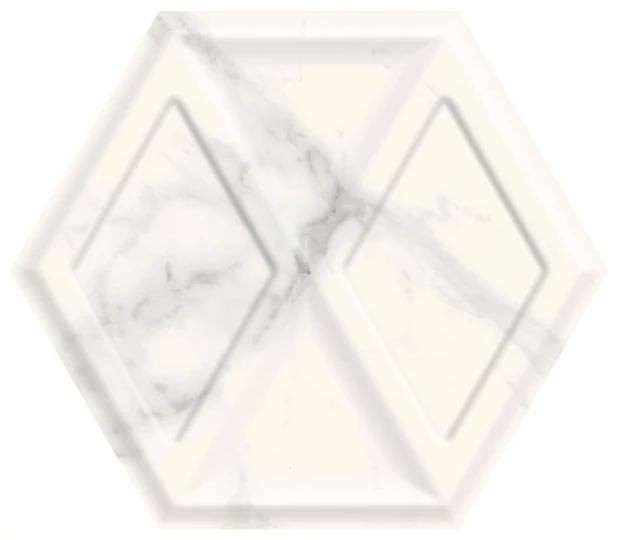 Morning Bianco Heksagon STR to mała glazura heksagonalna o nieregularnej, sześciokątnej formie. Jej powierzchnia jest strukturalna, co można zauważyć w delikatnych załamaniach i subtelnych wypukłościach na płytce. Kolorystyka nawiązuje do marmurowych wzorów, gdzie biel przeplata się z szarymi, rozmytymi liniami, nadając produktowi nowoczesny i jednocześnie naturalny charakter. Ten model wyróżnia się wśród innych drobnymi detalami, które nadają każdej płytce niepowtarzalny wygląd.