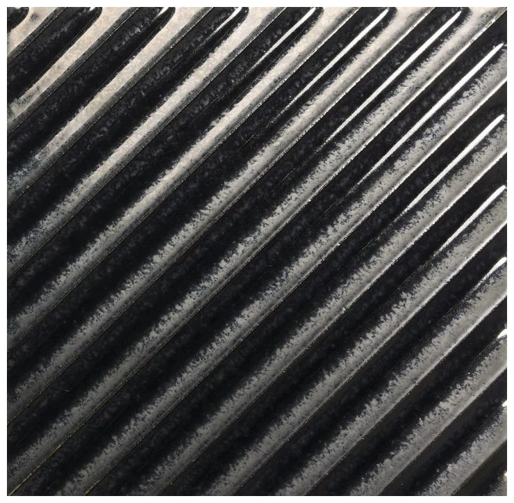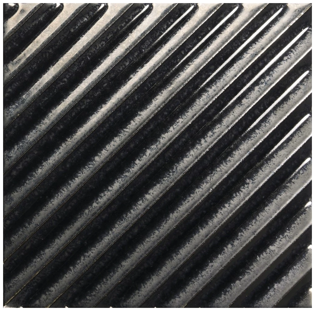 Dautore Enzo Metallo to mała płytka ścienna o wymiarach 13x13 cm, która wyróżnia się metalicznym, nieco surowym wyglądem. Wzór opiera się na nachylonych pasach o ciemnym, metalicznym odcieniu z akcentami szarości i jasnych refleksów. Powierzchnia jest błyszcząca, co dodaje głębi i wizualnego kontrastu pomiędzy wybrzuszonymi i płaskimi fragmentami. Ten rodzaj wykończenia sprawia, że płytka łapie światło w różnych kątach, co nadaje jej bardziej dynamiczny charakter.