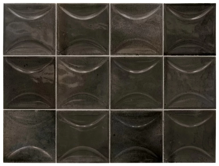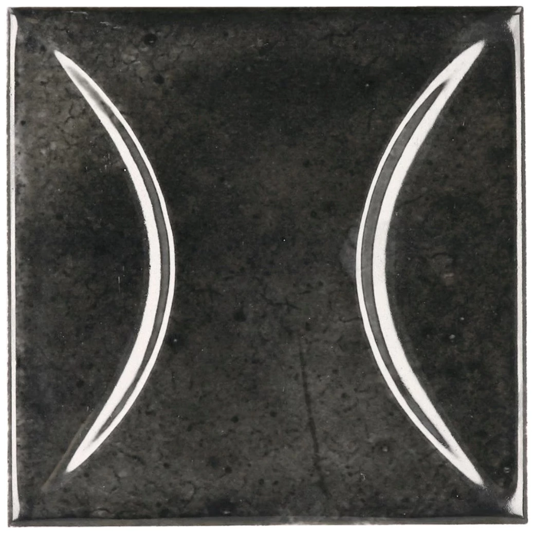 Hanoi Arco Black ASH to niewielki kafelek ścienny o wymiarach 10x10 cm, który wyróżnia się ciemną, głęboką czernią z dwoma delikatnymi, białymi łukami po bokach. Powierzchnia płytki jest błyszcząca, co podkreśla jej intensywność i nadaje eleganckie wykończenie. Kafelek ma wyraźnie zarysowane krawędzie, a delikatne nieregularności w kolorze oraz strukturze sprawiają, że efekt wizualny jest subtelnie niejednolity.