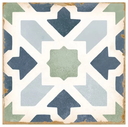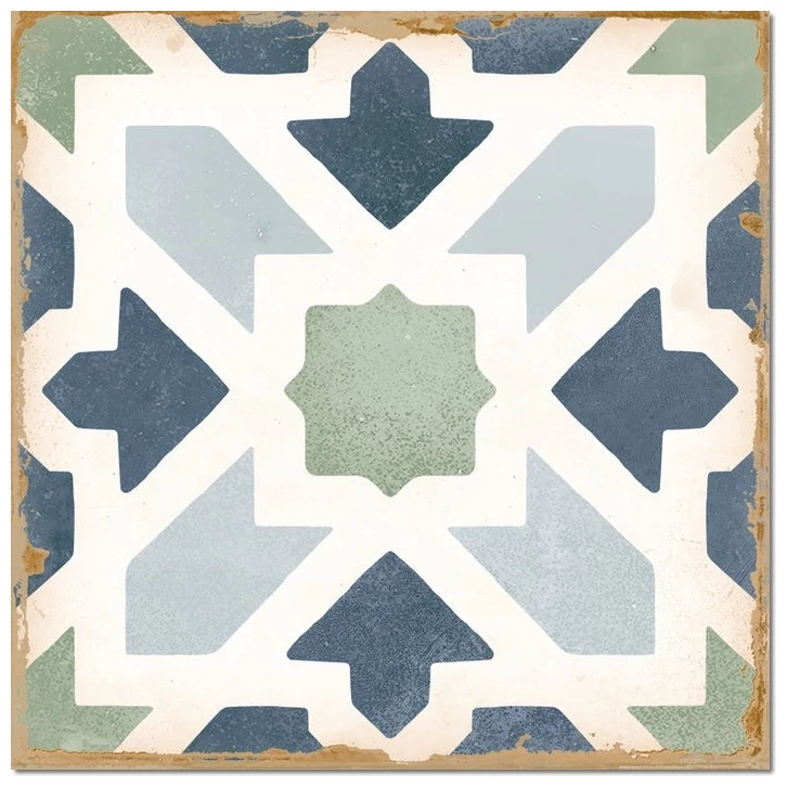 Casablanca Kenzi to niewielka płytka podłogowa o rozmiarze 12,5x12,5 cm, wpisująca się w kolekcję Harmony Casablanca od hiszpańskiego producenta Peronda. Jej powierzchnia jest matowa, co wpływa na subtelne wykończenie bez błysku i efektu połysku. Kolory oraz wzór na płytce odbierają się jako stonowane i wyważone - dominuje zestaw barw zawierający odcienie niebieskiego, zieleni oraz bieli. Matowa struktura dodatkowo podkreśla geometryczną kompozycję, która nie jest nachalna, a przez to lepiej dopasowuje się do różnych aranżacji.