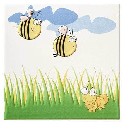 Obrazek na płytce przedstawia dwie pszczółki oraz gąsienicę na tle trawy i nieba z chmurkami. Kolory są stonowane, jasne, co klasyfikuje tę małą dekoracyjną płytkę jako element podkreślający wnętrza użytkowe, ale z lekkim akcentem przyjaznym dzieciom lub przestrzeniom, gdzie chcemy dodać trochę życia bez przesadnej dekoracyjności.