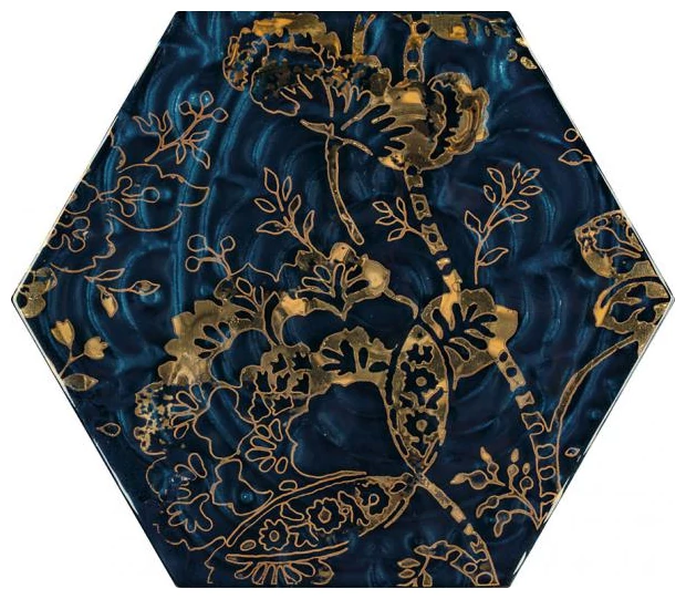 Urban Colours Blue C Heksagon dekor Szklany to niewielki produkt o powierzchni błyszczącej i wyraźnej strukturze. Jego kształt - heksagonalny - od razu zwraca uwagę i pozwala na ciekawe zestawienia wzorów. Kolorystyka utrzymana jest głównie w ciemnym, nasyconym odcieniu niebieskiego, na tle którego wyróżniają się złote, roślinne detale. Te detale mają wyraźne kontury i wprowadzają subtelną dynamikę, co daje efekt przestrzenności i głębi powierzchni.