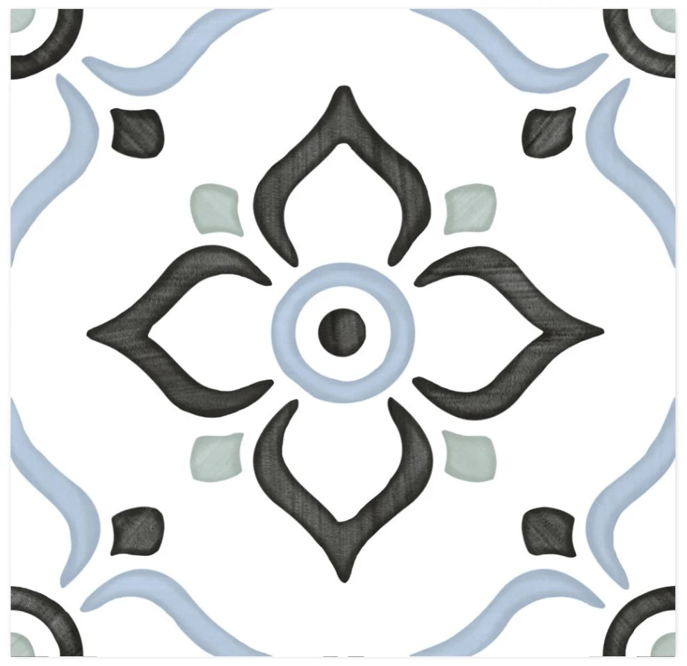 Rysunek na płytce utrzymany jest w stonowanej gamie: delikatne odcienie czerni, błękitu i mięty na białym tle. Całość wygląda oszczędnie, lecz nie ubogo - wzór zachowuje lekkość, a zarazem wyraźny charakter. To nietypowa kolorystyka, która wyróżnia się wśród popularnych jednobarwnych rozwiązań.