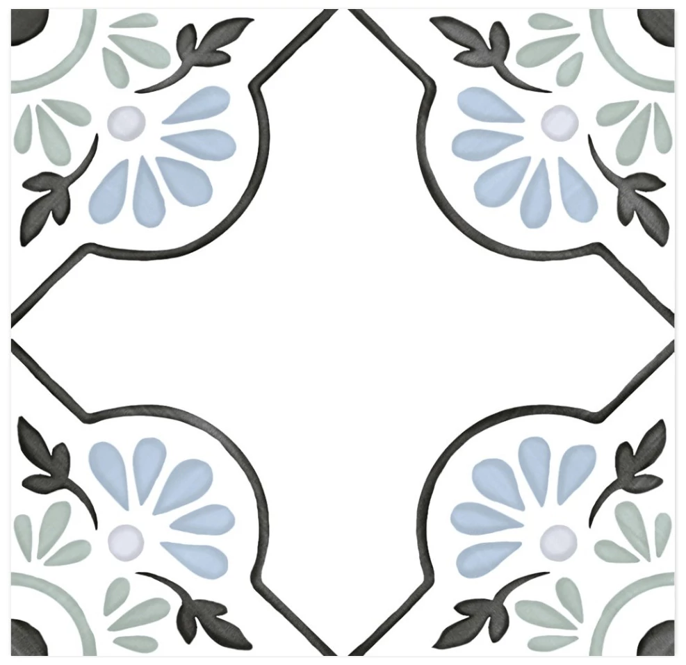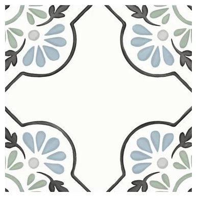 Tanger Blue Petals gres 12,3x12,3 to przykład małego gresu, który mimo niewielkich wymiarów przyciąga uwagę detalem. Na białym tle pojawiają się czarne kontury i delikatne, pastelowe wstawki niebieskich oraz zielonych elementów, które tworzą wzór przypominający rozłożyste płatki czy liście. Powierzchnia jest matowa, co zapobiega odbłyskom i poprawia odbiór tej subtelnej kolorystyki. Ten wyrób pozwala na zaaranżowanie przestrzeni z wyraźnym, ale nie krzykliwym akcentem.