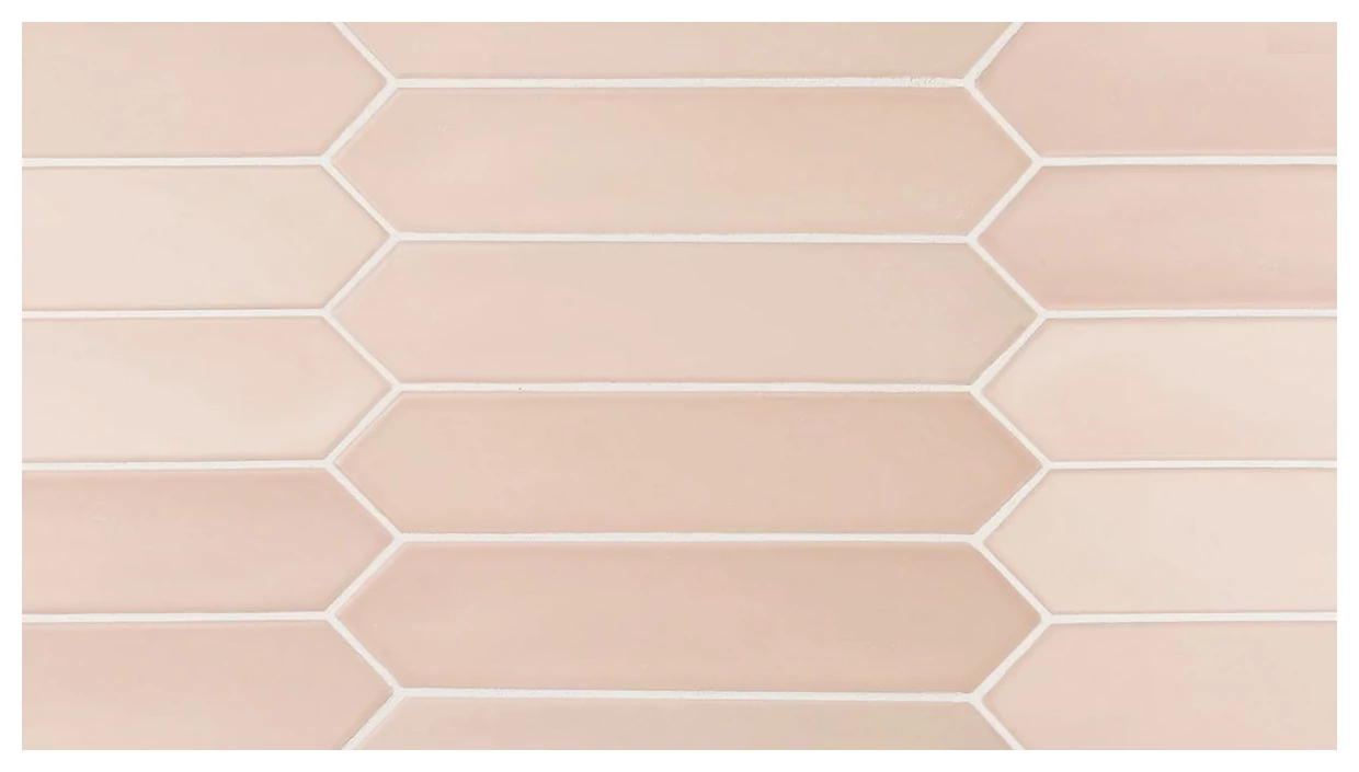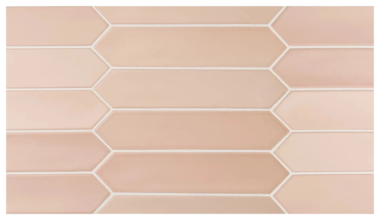 Płytki Lanse Rose o wymiarach 5x25 cm prezentują się w tonacji stonowanego różu. Kolorystyka jest delikatna, oparta na kilku odcieniach różu, które przechodzą od jaśniejszych do nieco bardziej nasyconych. Kształt płytek jest wydłużony z lekko ściętymi brzegami, co pozwala na ciekawą i niestandardową aranżację na ścianie. Układ elementów daje wrażenie uporządkowanego, a jednocześnie lekko urozmaiconego wzoru.
