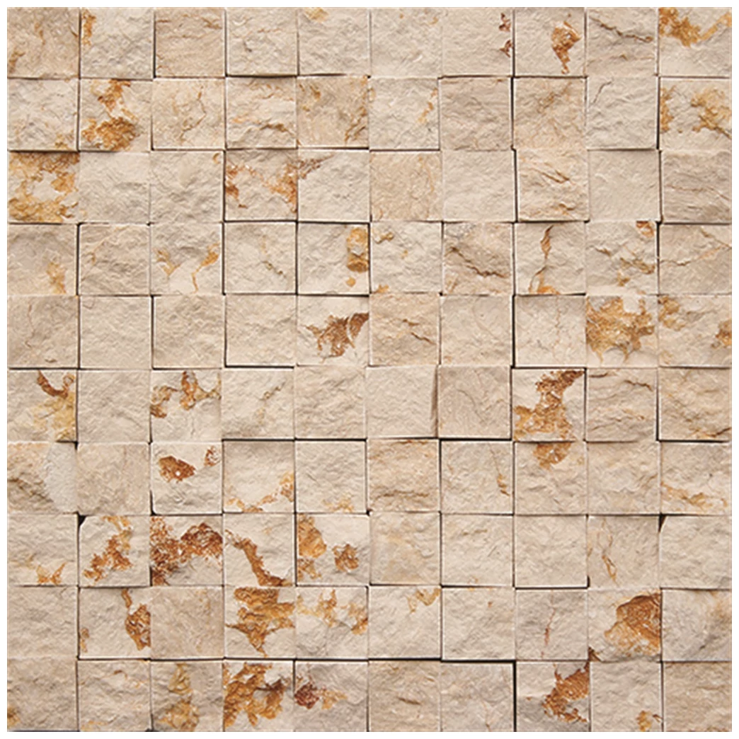 Ta matowa mozaika do łazienki i kuchni kamieniopodobna wyróżnia się surową, kamienną fakturą. Kamienna struktura płytek przyciąga wzrok swoją różnorodnością wykończenia i lekko nieregularną powierzchnią. Widoczne na niej różne odcienie beżu i delikatne przebarwienia w ciepłych tonacjach dodają naturalnego charakteru. Widać tu wyraźnie efekt powierzchni przypominający prawdziwy kamień, co nadaje wnętrzu nieco surowego, ale szlachetnego klimatu. To nie jest gładka, idealnie wykończona powierzchnia - wręcz przeciwnie, faktura jest wyczuwalna i widoczna, co ma swoje znaczenie zarówno estetyczne, jak i praktyczne.