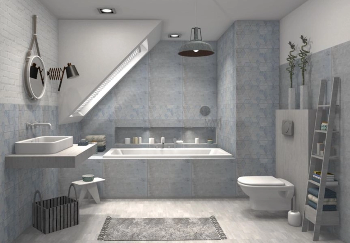 Cementino Cube dekor 25x60 to matowa płytka dekoracyjna geometryczna, która przykuwa wzrok swoim wyważonym wzorem. Szarości przeplatają się tu z chłodnymi, delikatnymi błękitami, tworząc abstrakcyjną mozaikę złożoną z rombów i sześciokątów. Powierzchnia jest matowa, co ogranicza odbicia i nadaje płytce wyraźną, surową teksturę. Dzięki temu wzór nie jest krzykliwy, choć jest wyrazisty i charakterystyczny.