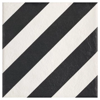 Produkt, który przykuwa uwagę wyraźnym, geometrycznym wzorem, oparty jest na zestawieniu skośnych pasów w dwóch kontrastujących kolorach - czerni i bieli. Cała powierzchnia jest matowa, co nadaje jej subtelnej powściągliwości w wykończeniu, a jednocześnie minimalizuje odbicia światła. Strukturalna powierzchnia wpływa na niejednolitą fakturę, dzięki czemu płytka zyskuje dodatkowy wymiar - nie jest płaska i przewidywalna, lecz wyraźnie wyczuwalna pod ręką.