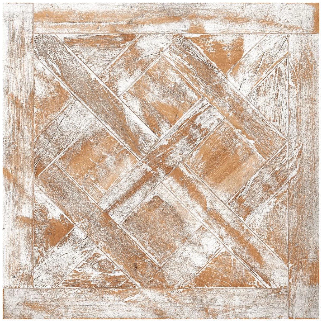 Na powierzchni zauważyć można charakterystyczny wzór mozaiki drewnianych desek, które przecinają się pod kątem, tworząc geometryczną kompozycję. Kolorystyka to jasne odcienie bieli i ciepłego brązu, co nadaje podłodze nieco postarzały, rustykalny charakter - bez połysku i powierzchni lśniącej, bardziej technicznej.