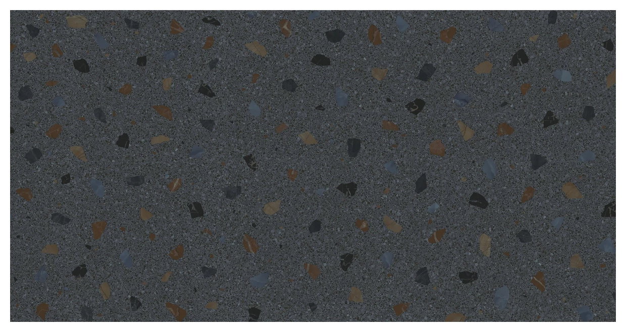 Terratzo Negro to matowa płytka do łazienki i kuchni, która przyciąga uwagę nieregularną fakturą lastryko. Na ciemnoszarym, niemal czarnym tle rozmieszczone są niewielkie, wielobarwne fragmenty - głównie w odcieniach grafitu, brązu, czerni i szarości. Te rozproszone elementy tworzą efekt powierzchni typowy dla lastryko, który ożywia całość, nadając jej wyrazistości i charakteru bez przesadnej pretensjonalności.