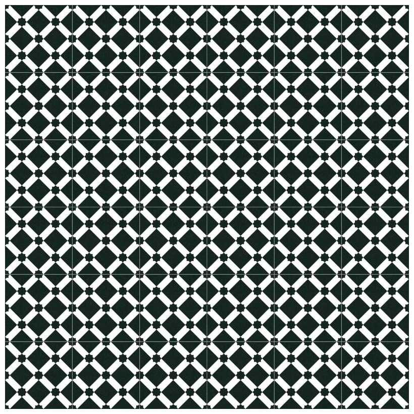 Palau Grafito to matowa płytka podłogowa o wymiarach 20x20 cm, która bardzo mocno stawia na porządek i wyrazistość wzoru. Geometryczny motyw, z którym mamy do czynienia, przykuwa uwagę regularnością i kontrastem czerni i bieli. Czarna część płytki ma lekko ziarnistą fakturę, która dodatkowo wzmacnia efekt matowej powierzchni - tu nie ma błysku, za to jest wyraźne graficzne ułożenie elementów. Całość wygląda surowo, ale jednocześnie uporządkowanie i przejrzystość grafiki wprowadzają dobrze widoczny rytm.