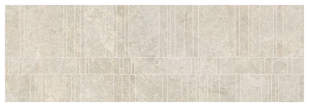 Haven Sand dekor 33,3x100 to glazura dekoracyjna o matowej powierzchni, co sprawia, że nie odbija światła ani nie błyszczy intensywnie. Delikatna, stonowana szaro-beżowa kolorystyka tworzy neutralne tło, które nie przytłacza aranżacji. Powierzchnia posiada wyraźne, geometryczne wzory, podzielone regularnymi liniami, nadając całości uporządkowany, nowoczesny charakter.