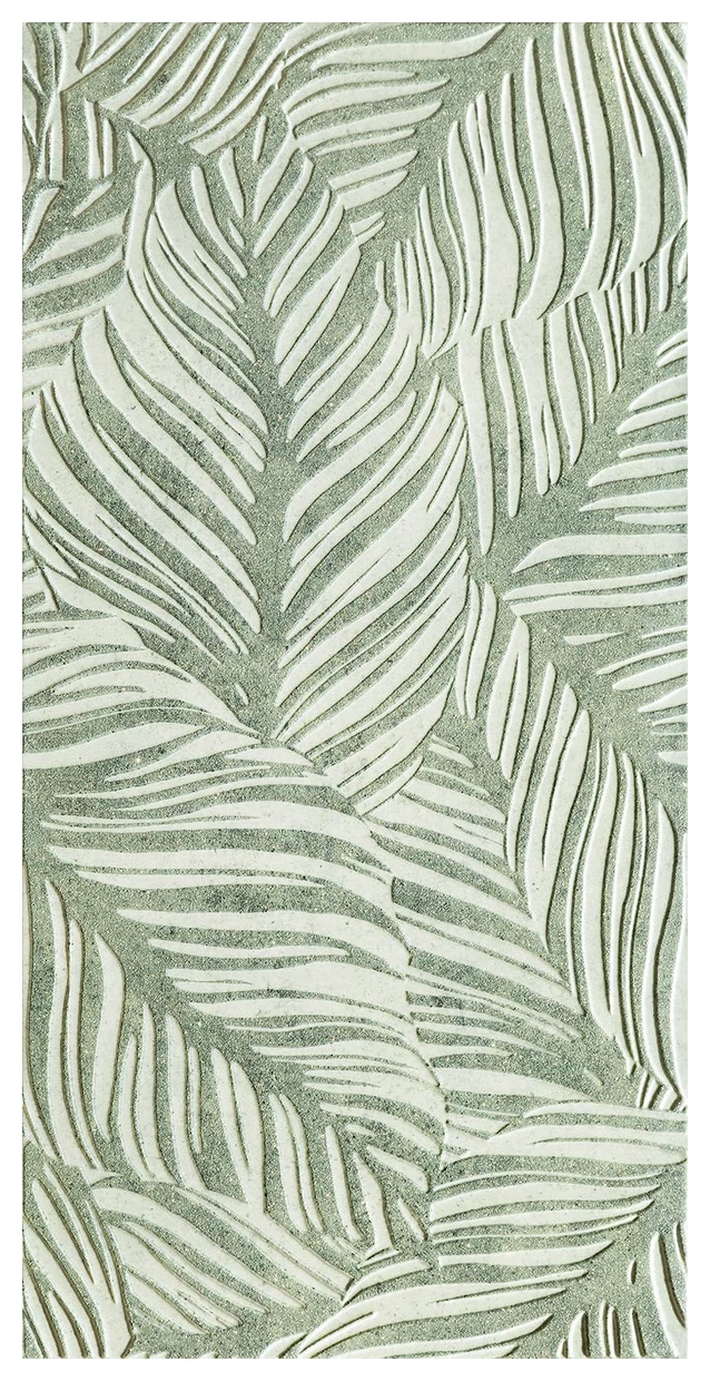 Płytka dekoracyjna Touch 2 dekor 29,8x59,8 od Tubadzin charakteryzuje się interesującym, przestrzennym wzorem. Motyw liści przebiega przez całą powierzchnię, z wyraźnym podziałem na wypukłe oraz wklęsłe partie. Detal jest wyraźny, co daje grafice wyrazistość i zauważalny efekt reliefu.