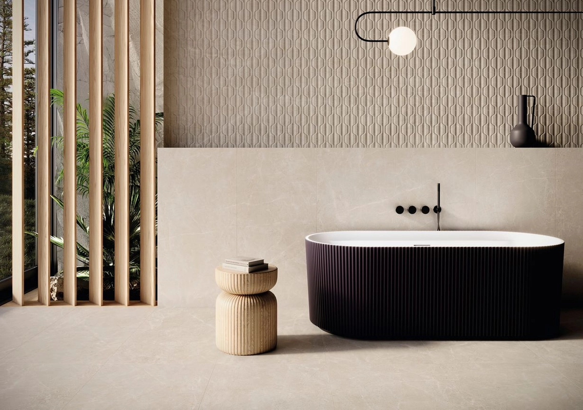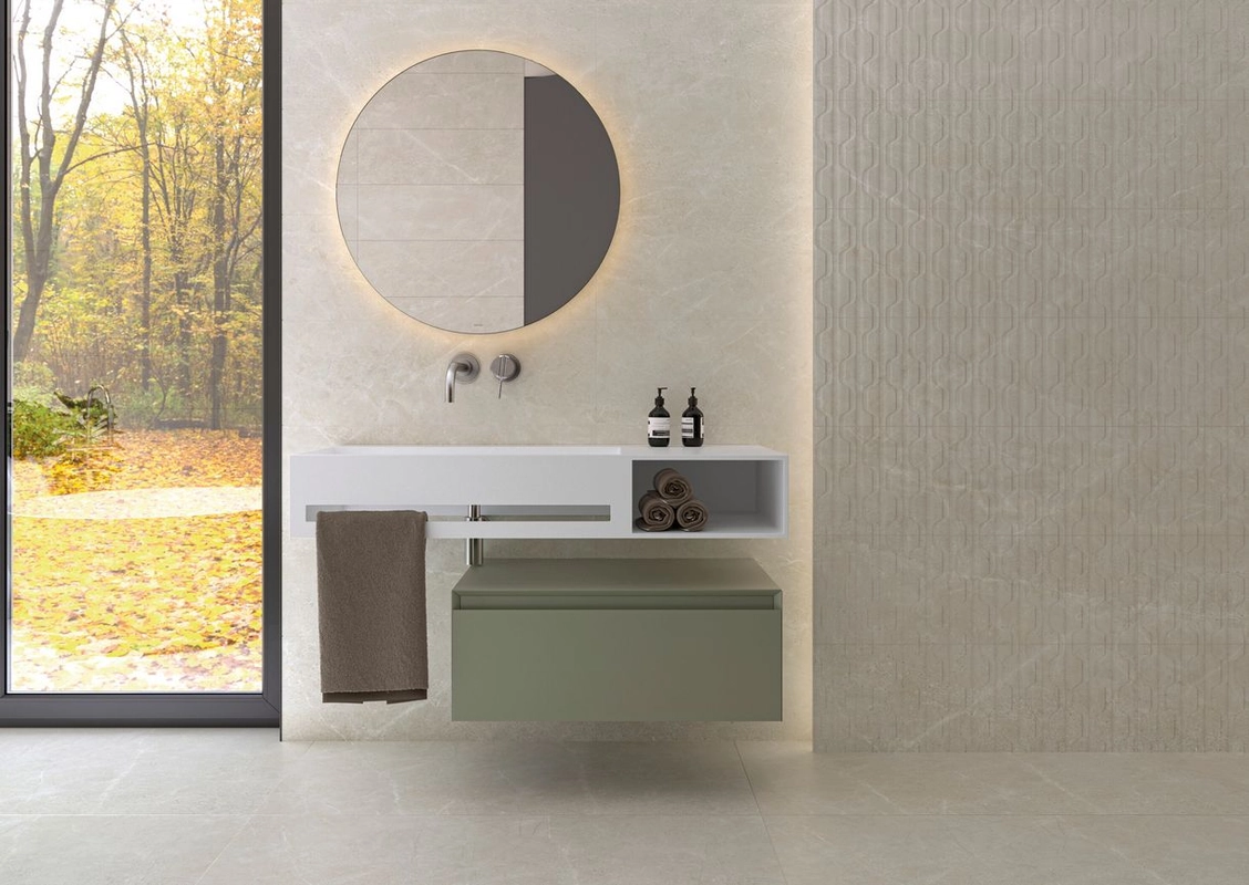 Format 120,0 x 120,0 cm sprawia, że pojedyncze płytki tworzą spójną, szeroką płaszczyznę. Kolorystyka i struktura dobrze wpisują się w aranżacje, gdzie zależy na neutralnym, naturalnym tle zamiast mocnego akcentu.
