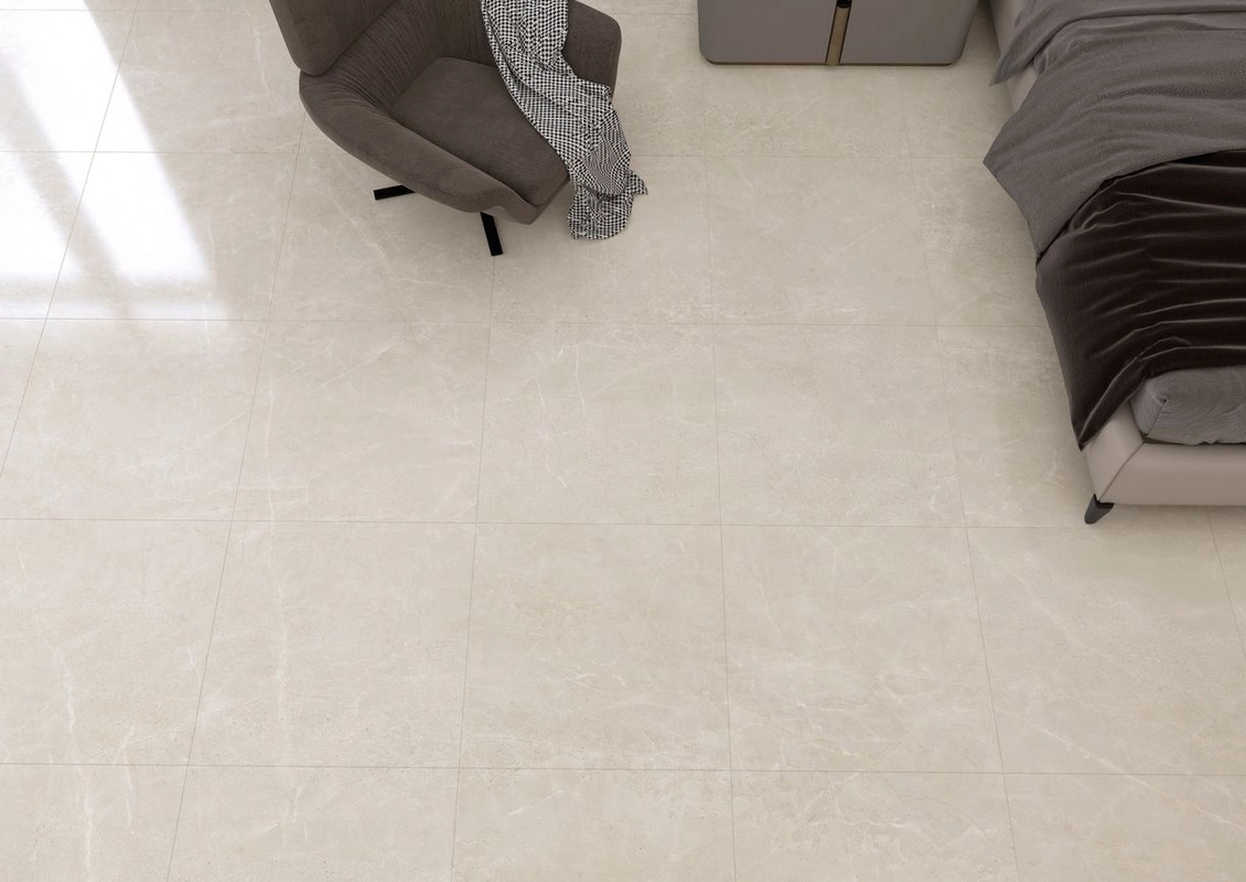 Athea Cream to płytka w tonacji kremowo-beżowej z delikatnym żyłkowaniem przypominającym naturalny kamień. Powierzchnia jest matowa, co ogranicza refleksy światła i daje bardziej stonowany, użytkowy efekt. Wzór rozłożony jest równomiernie, bez ostrych kontrastów, detale żyłek występują subtelnie i nie dominują całej powierzchni.