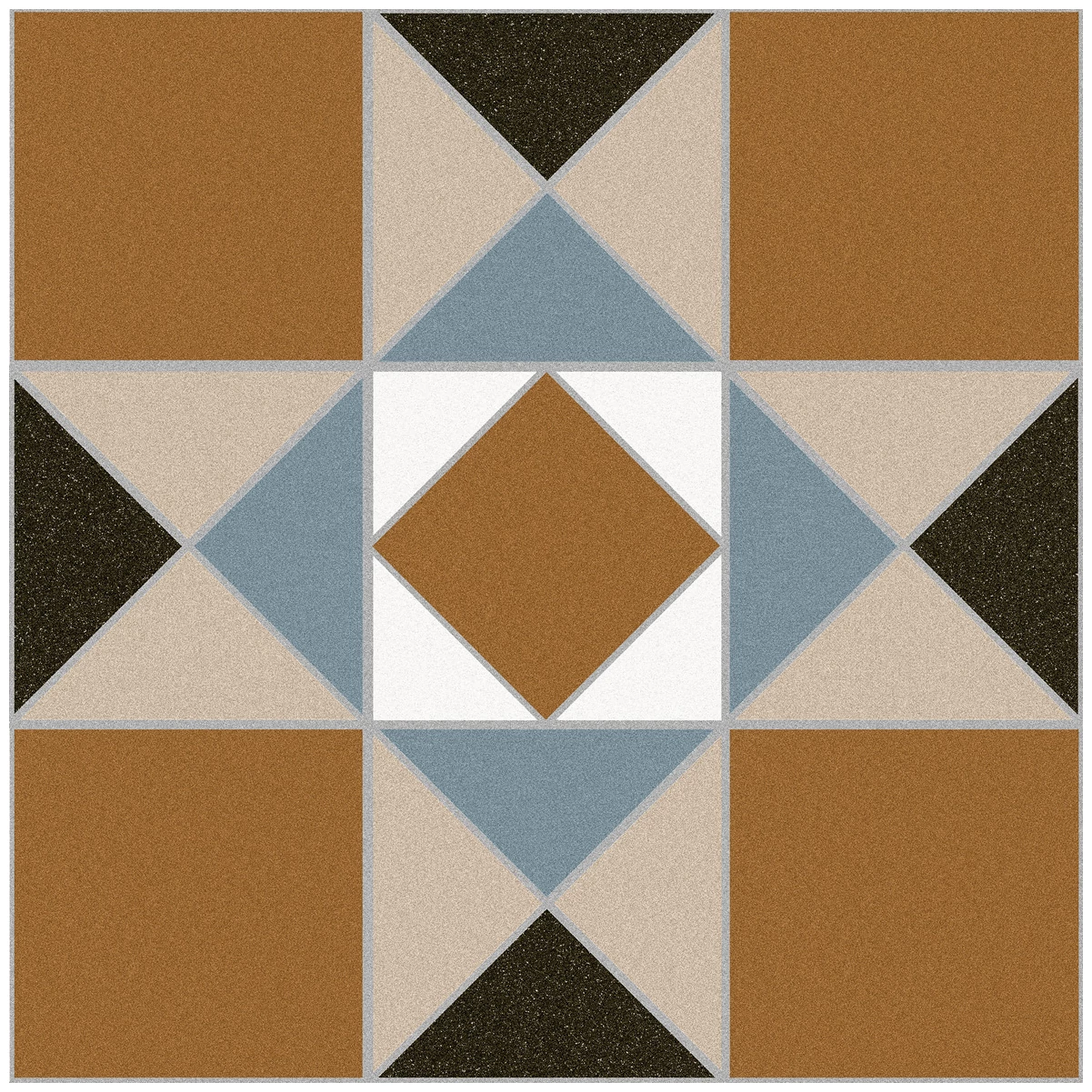 Ten matowy gres geometryczny wprowadza do przestrzeni powściągliwość barw i wyrazistość linii. Kolory beżowe, brązowe, niebieskie oraz czarne tworzą układ dający poczucie uporządkowania i aktu wizualnej klarowności. Jeśli potrzebujesz podłogi, która z jednej strony prezentuje się estetycznie, a z drugiej nie męczy wzroku, tu znajdziesz odpowiedź.