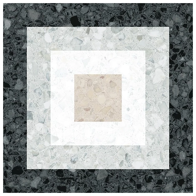 Kolory występujące w gresie mają neutralne, stonowane tony - przeważa biel, szarość i beż, z ciemniejszym akcentem wzdłuż krawędzi. Taka kompozycja nie jest nachalna i sprawdzi się zarówno w nowoczesnych, jak i bardziej klasycznych pomieszczeniach, które potrzebują trwałego, ale i estetycznego rozwiązania do podłogi.