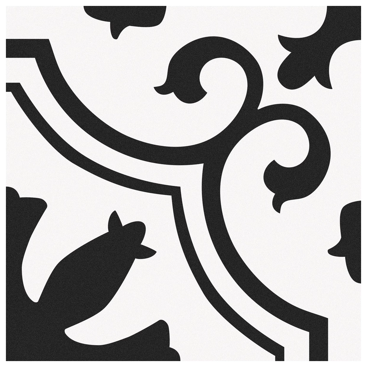 Mamy tutaj matowy gres z wyraźnym, aczkolwiek nie przesadnie skomplikowanym wzorem. Czarny wzór na białym tle tworzy wrażenie uporządkowanej kompozycji, która jednocześnie nie męczy wzroku. Wzór wykorzystuje zarówno ostre linie, jak i łagodne krzywizny o nieregularnych kształtach, co sprawia, że płytki wyróżniają się spośród standardowych propozycji. Ten motyw geometryczny jest dosyć klasyczny, ale przy tym pozwala na ciekawe aranżacje, nie przytłaczając przestrzeni.