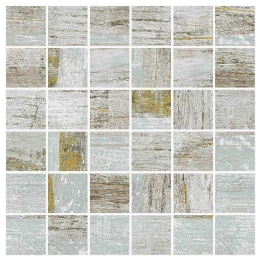 Mozaika gresowa hiszpańska w stylu rustykalnym prezentuje się bardzo surowo, ale jednocześnie bogato w detale. 5x5 cm małe kwadratowe elementy tworzą przypominającą naturalny kamień powierzchnię o wymiarze całego panelu 29,75x29,75 cm. Kolory to mieszanka szarości, bieli z akcentami delikatnego beżu i pożółkłych, zardzewiałych elementów. Całość doskonale oddaje charakter materiałów o nieregularnej, matowej fakturze.
