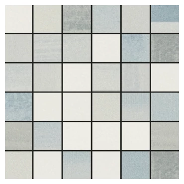Wzór jest oparty na kwadratowych kafelkach o wymiarze 29,75x29,75 cm, ułożonych w regularną siatkę 5 na 5. Kolorystyka oscyluje wokół neutralnych szarości i delikatnych błękitów, które przywodzą na myśl klasyczny, lecz nieprzesadzony styl vintage. Powierzchnia matowa dodaje subtelnej surowości, unikając jakiegokolwiek połysku, co sprzyja utrzymaniu naturalnego charakteru gresowej mozaiki.