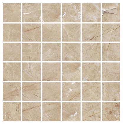 Imarble Breccia to mozaika gresowa imitująca marmur o wymiarze 29,75x29,75 cm, składająca się z małych kwadratów 5x5 cm. Jej powierzchnia lappato oddaje naturalny charakter kamienia, jednocześnie oferując lekko matowy połysk, który przyciąga uwagę bez nadmiaru blasku. Widoczne na kaflach delikatne żyłkowanie i kontrasty kolorystyczne w ciepłych beżowych tonacjach tworzą efekt autentycznego marmuru, co pozwala na aranżacje przestrzeni z wyczuciem i stylem.