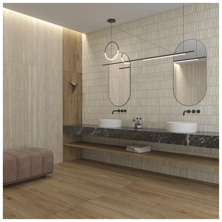- Elegancki beżowy kolor i struktura inspirowana trawertynem.