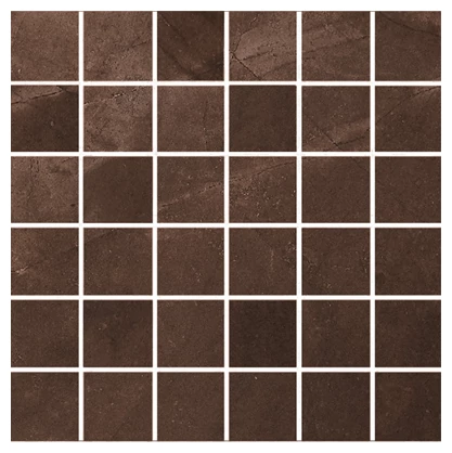Imarble Pulpis to mozaika gresowa marmuropodobna o wyrazistym, ciemnym brązowym odcieniu. Każdy kafelek ma format 29,75x29,75 cm, a całość tworzy siatkę złożoną z drobnych kwadratów 5x5 cm. Powierzchnia lappato podkreśla naturalną subtelność marmuru, nadając produktowi lekko satynowy połysk. Dzięki temu, nie jest to typowa, błyszcząca glazura - powierzchnia zachowuje umiarkowany refleks światła, co pozwala uniknąć efektu przeładowania przestrzeni połyskliwymi detalami.