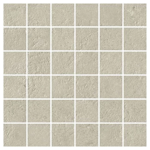 Produkt Tivoli Ivory Cross-Cut Natural 5x5 to mozaika gresowa w odcieniach bieli i jasnych beżów, która cechuje się matową powierzchnią. Powierzchnia mozaiki naśladuje strukturę betonu, jednak jest znacznie bardziej subtelna i jednolita, nieco surowa w wyrazie, ale bez efektu przesadnej szorstkości. Kolory są wyważone i naturalne, co sprzyja aranżacjom stonowanym, ale bez monotonii. Proporcje płytek 5x5 cm oraz ich rozmieszczenie na siatce dają możliwość uzyskania efektu dużej powierzchni - cała mozaika, złożona z małych kwadratów ułożonych w regularną siatkę, ma wymiar 29,75x29,75 cm.