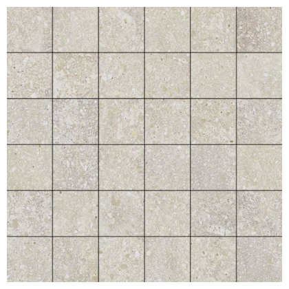 Ten produkt prezentuje mozaikę gresową w matowym wykończeniu, która w naturalny sposób przypomina kamień. Kolorystyka utrzymana jest w jasnych, kremowo-beżowych barwach, z delikatnie widocznymi nieregularnościami i strukturą imitującą minerały. Dzięki temu powierzchnia nie jest monotonna - różnorodność odcieni i wzorów podkreśla autentyczność kamieniopodobnego efektu. Taka mozaika o wymiarze 29,75x29,75 cm i układzie 5x5 daje sporo możliwości aranżacyjnych oraz tworzenia ciekawych, wielowymiarowych kompozycji.