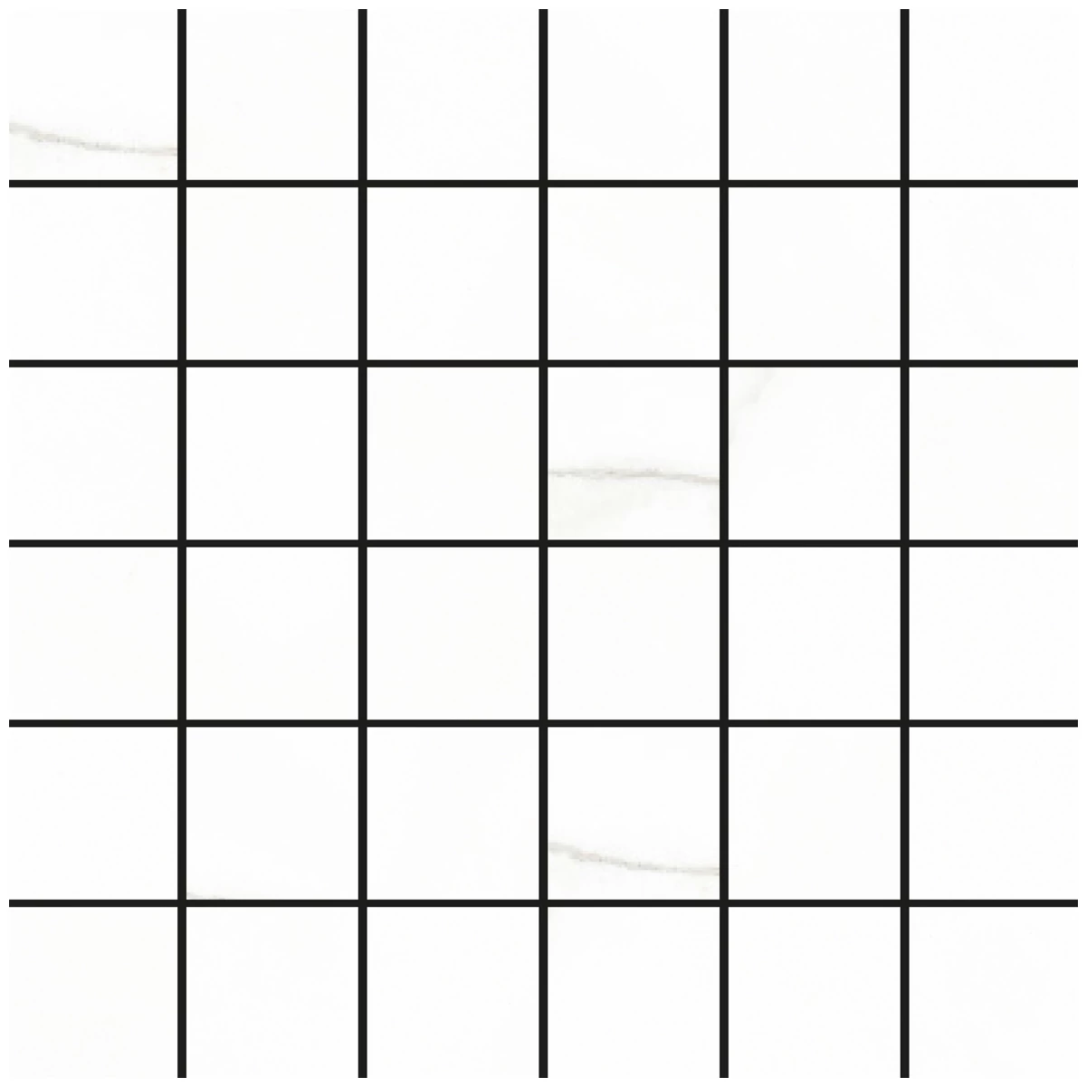 Marbox Calacatta 5x5 to mozaika gresowa o wymiarach 29,75x29,75 cm. Charakteryzuje się delikatnym, marmurowym wzorem, który jest subtelny, ale jednocześnie dobrze widoczny na matowej powierzchni. Białe, duże płytki mozaiki są ułożone w regularne kwadraty o wymiarze 5x5 cm, a ich rozmiar sprawia, że wzór zachowuje czytelność i przejrzystość. Efekt marmuru w naturalny sposób urozmaica całość - pojawiają się na powierzchni niewielkie, jasnoszare żyłki, które nie dominują, lecz dopełniają estetykę powierzchni.