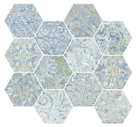Ta mozaika gresowa patchworkowa heksagonalna to propozycja dla tych, którzy szukają niestandardowej dekoracji ścian lub podłóg. Jej duże, sześciokątne elementy mają matową powierzchnię, która łagodzi odbicia światła, pozostawiając przyjemne w dotyku wykończenie. Każda płytka prezentuje inny wzór, co sprawia, że całość tworzy oryginalny miks - patchwork łączący różnorodne desenie w odcieniach niebiesko-szarych. To wyraźny akcent dekoracyjny, ale nie krzykliwy - raczej dyskretny i interesujący zarazem.