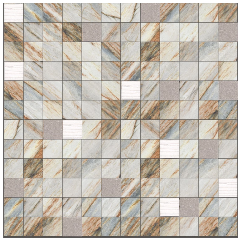 Luxor Quartzite Aurora to mozaika o wymiarach 29,75x29,75 cm, która łączy w sobie kamienny efekt z połyskującą powierzchnią. Jej niewielkie kafelki, po 2,5x2,5 cm, tworzą ciekawą kompozycję o dużych rozmiarach, gdzie można dostrzec delikatne przejścia kolorystyczne - od beżów, przez szarości, aż po rdzawo-miedziane akcenty.
