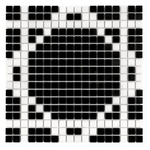Prezentowana mozaika kamienna to zestaw drobnych kwadratowych elementów w wymiarze 30,5x30,5 cm. Kolory zdecydowanie opierają się na wysokim kontraście czerni oraz bieli, co tworzy czytelny wzór geometryczny. Powierzchnia jest błyszcząca, co powoduje, że mozaika zyskuje lekko połyskliwy efekt, odbijający światło. Układ mozaiki jest precyzyjnie zaprojektowany, z wyraźnym, centralnym czarnym polem otoczonym białymi oraz czarnymi detalami, dzięki czemu uzyskujemy zorganizowaną, ale wyrazistą strukturę.