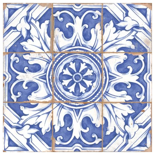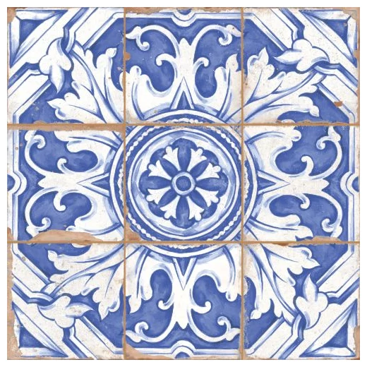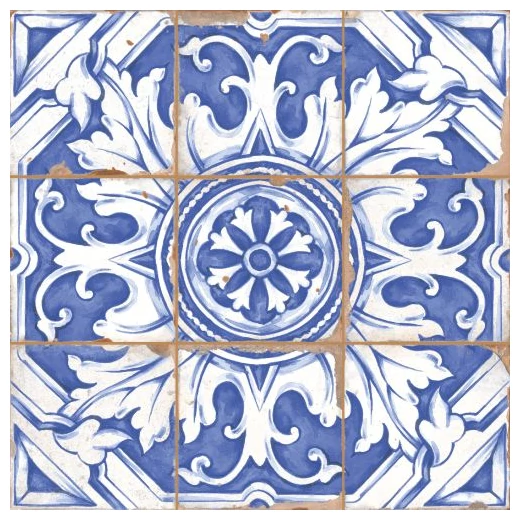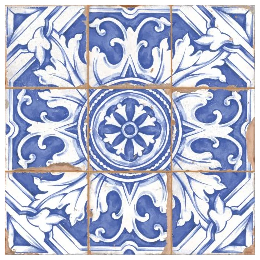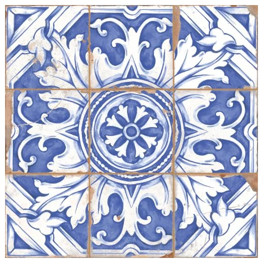 FS Minori LT od Peronda to niezwykle charakterystyczna terakota podłogowa o wymiarach 33x33 cm, wyróżniająca się wyrazistym motywem patchworkowym. Jest to płytka matowa, co oznacza, że powierzchnia nie odbija światła, przez co wnętrze zyskuje na naturalnym, stonowanym wyrazie. Zestaw kompozycji kwadratów złożonych z detali roślinnych i geometrycznych tworzy spójną całość. Kolorystyka opiera się głównie na intensywnym odcieniu niebieskiego przeplatanego z bielą, uzupełniona detalami nawiązującymi do naturalnej, lekko postarzałej powierzchni - takie miejsca oczywiście nie są przypadkowe, a celowe, dodają autentyczności i klimatu.