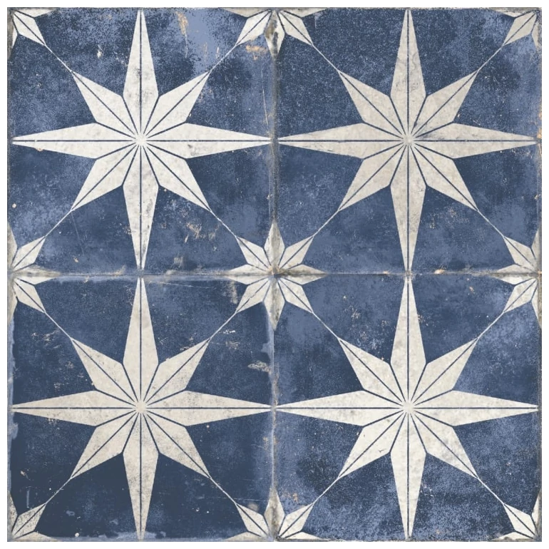 Kolorystyka: dominujący granat z jasnym, niemal kremowym rysunkiem gwiazdy. Wzór ma geometryczny, powtarzalny układ, linie łączą się w narożnikach, tworząc dodatkowe mniejsze motywy w punktach styku. Widoczne są celowe przetarcia i plamkowanie, które nadają płytce rustykalny charakter bez gładkiego, lśniącego wykończenia.