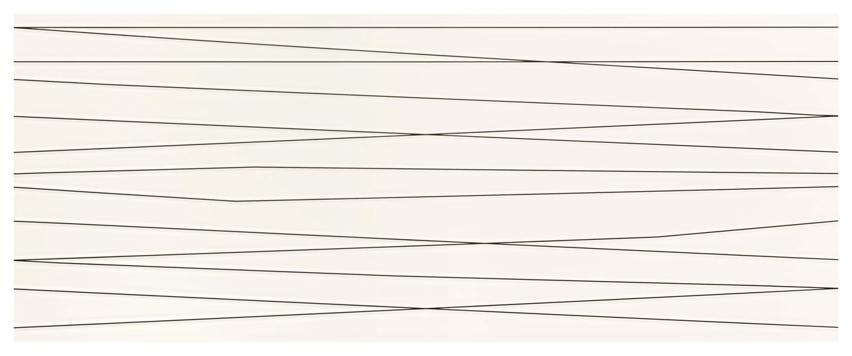 Na powierzchni płytki widoczny jest delikatny wzór składający się z cienkich, prostych linii przecinających się pod różnymi kątami. Wzór jest uporządkowany, ale nie monotematyczny - sprawia, że powierzchnia zyskuje na dynamice bez nadmiernego złożenia. Zestawienie jasno białego tła z liniami w kolorze czarnym podkreśla kontrast i czytelność, co jest praktyczne w kontekstach kuchennych i łazienkowych.