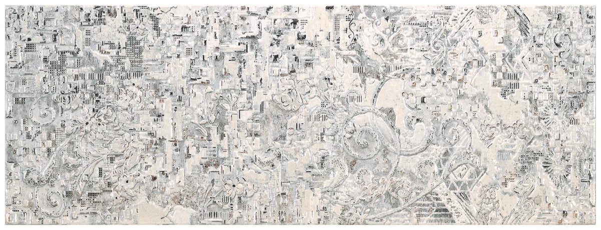 Marbox A dekor 44,63x119,3 to płytka, która łączy w sobie charakterystyczny dla kolekcji Marbox efekt kamienia z bogatym wzorem utrzymanym w stylistyce retro. Rysunek na powierzchni jest nieregularny, podzielony na różnorodne sekcje, które momentami przypominają kompozycje z klasycznych motywów dekoracyjnych - kwiaty, geometryczne detale i stylizowane ornamenty. Całość utrzymana w stonowanej, chłodnej kolorystyce z przewagą bieli i szarości, które tworzą matową i nieodbłyskową powierzchnię. Taka faktura sprawia, że płytka nie tylko prezentuje się autentycznie, ale także wydaje się bardziej naturalna i wyciszona.