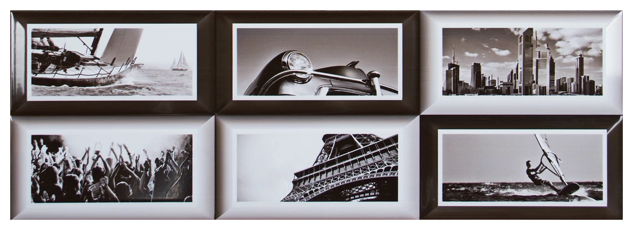 Metro Black B dekor 20x59,2 to glazura dekoracyjna, która przyciąga uwagę głównie dzięki swojej nietuzinkowej stylistyce. Prezentuje zestaw sześciu obrazków w tonacji czarno-białej, umieszczonych w formacie prostokątnym o wymiarach 20x59,2 cm. Każdy z nich wygląda niemal jak okno na różne sceny - od klasycznych motywów miejskich po chwile z życia codziennego, jak żeglowanie czy sport wodny.