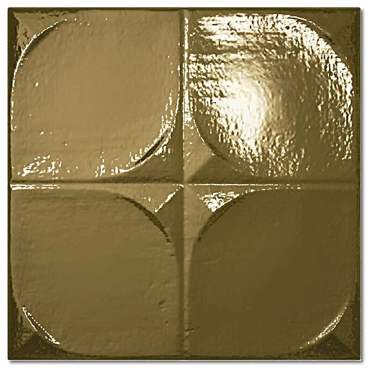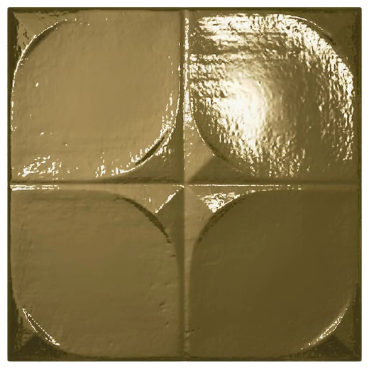 Płytka Sindhi ORO dekor o wymiarach 13x13 cm to mały element, który przykuwa uwagę ciekawym, strukturalnym wzorem. Na powierzchni widoczne są zaokrąglone, wklęsłe formy tworzące oryginalną kompozycję. Dzięki błyszczącej powierzchni płytka odbija światło, co wzmacnia efekt trójwymiarowości i podkreśla detale. Widać tu także delikatne nuty stylu rustykalnego, co podkreśla jego hiszpański charakter. Faktura jest zauważalna, co sprawia, że płytka nie jest płaska i sprawia wrażenie bardziej wyrazistej niż typowa gładka glazura.