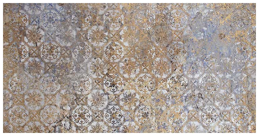 Carpet Vestige Natural to płytka dekoracyjna hiszpańska w stylu wiktoriańskim, która wyróżnia się złożonym wzorem znanym z klasycznych rozwiązań tego okresu. Na powierzchni o wymiarach 50x100 cm zauważalne są regularne elementy o geometrycznych kształtach oraz finezyjne ornamenty, które nadają jej wyrazisty charakter. Kolorystyka oscyluje wokół odcieni szarości, beżu i niebieskiego, tworząc efekt trochę postarzanego, ale bardzo autentycznego wykończenia.