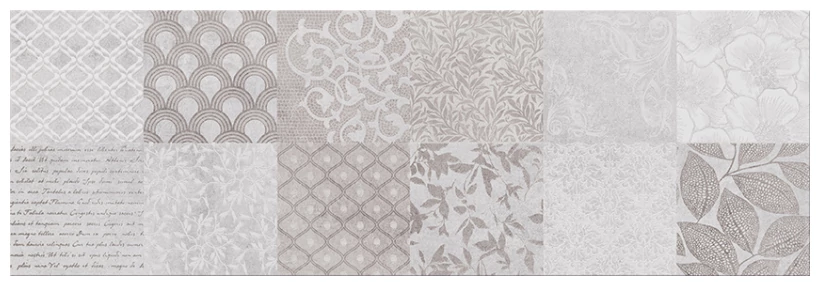 Snowdrops Patchwork dekor 20x60 to glazura dekoracyjna o matowej powierzchni. Płytka ma wymiary 20 na 60 cm oraz wyróżnia się patchworkowym wzorem, w którym przeplatają się różnorodne motywy - od delikatnych liści, przez ornamenty geometryczne, po florystyczne detale i fragmenty pisma. Całość utrzymana jest w stonowanej kolorystyce, łączącej odcienie szarości i beżu, co pozwala na subtelne wkomponowanie w wiele aranżacji. Ta płytka dekoracyjna patchwork do kuchni i łazienki doskonale urozmaici przestrzeń bez dominowania nad nią.